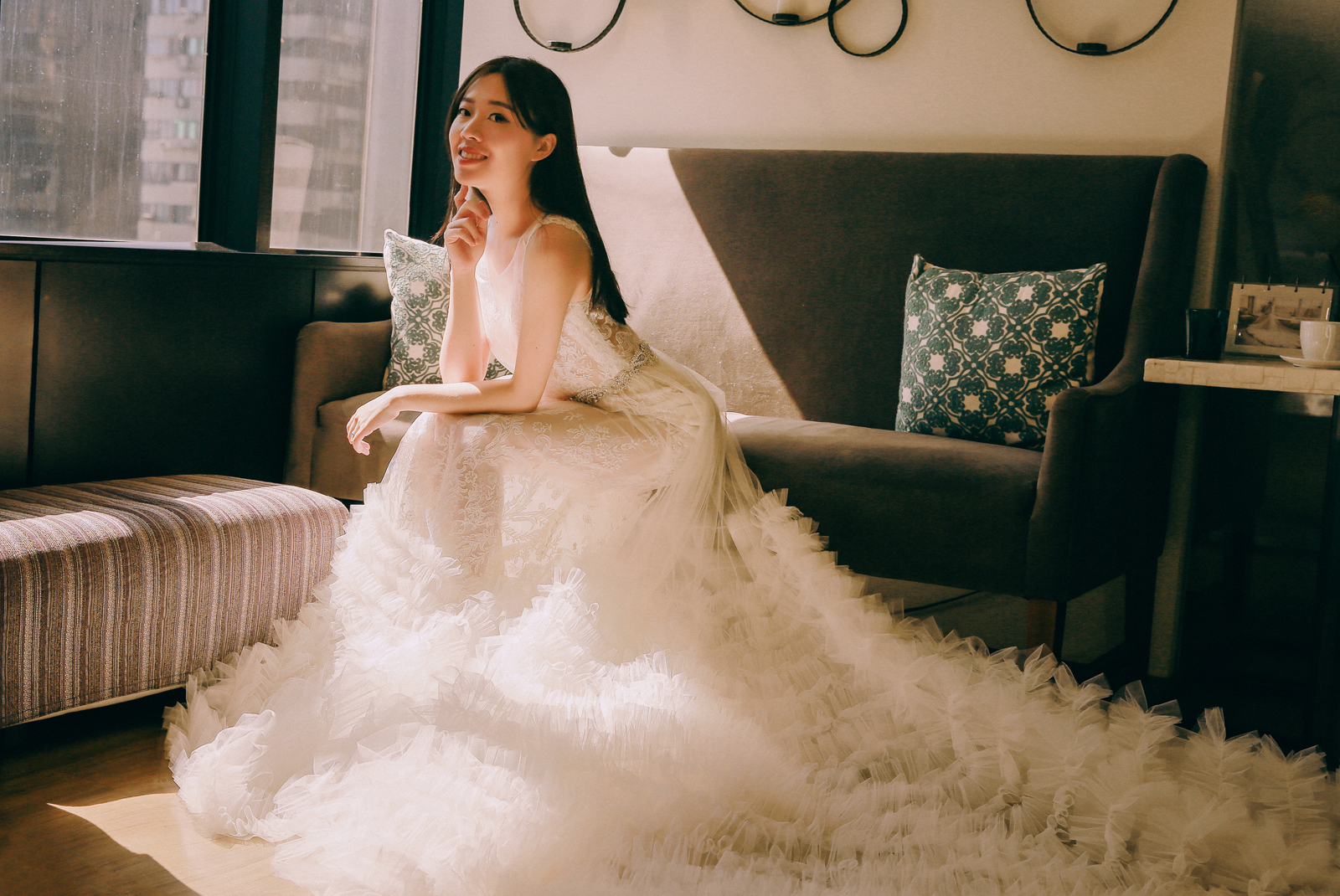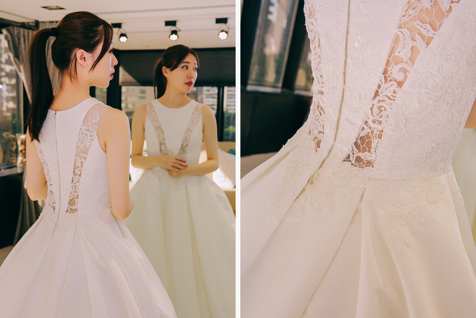 席爾試穿間總共有3間,試穿的空間不會擁擠並且隱密度很高,每間都有L形超大面鏡子,不管從正面、側面都可以完整呈現禮服穿起來的樣子,試穿間都有一個小沙發,讓親友可以舒適地坐在這邊,跟你一起討論禮服,這一次我總共穿了6套禮服,3套白紗3套晚禮服,也穿上了平常比較少見的款式,提供給大家更多樣的選擇。
