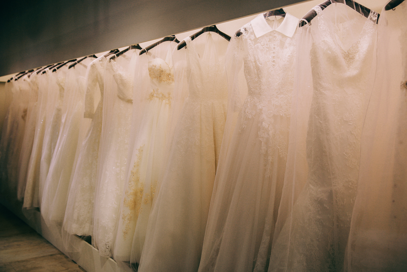 席爾禮服款式非常多~禮服都是掛出來可以直接供新娘挑選,這點是我最喜歡的,可以親自摸到質料跟版型,在挑選上也會比較快,禮服也分成款式及顏色分類掛好一目瞭然。