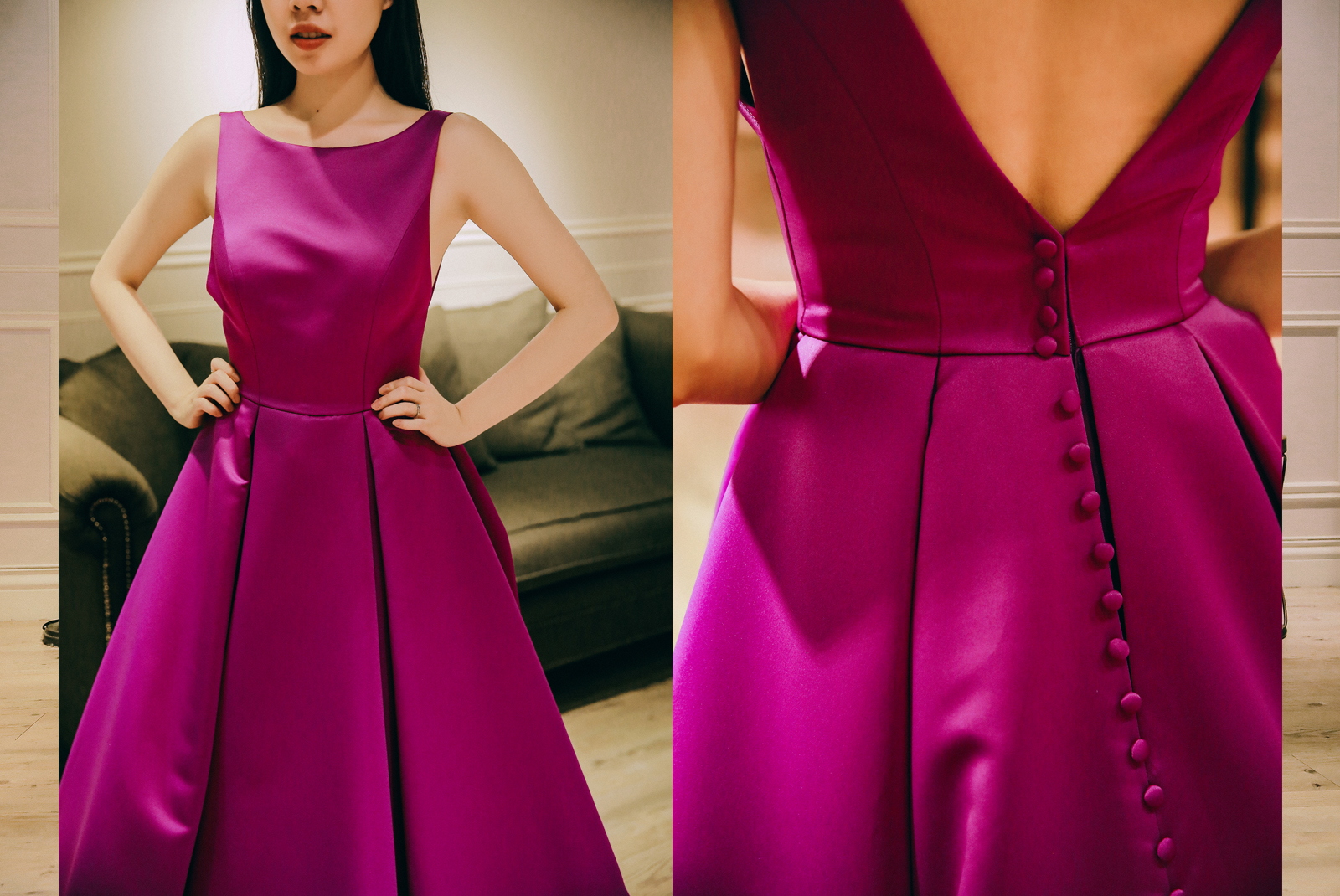 這件禮服立刻讓我想到迪士尼的公主,採用大膽的桃紫色,這個顏色在市面上也比較少見,可以讓膚色更顯白,不會過於俗氣記憶點很高,裙擺的剪裁設計也很特別,將折線做出來保持裙子的澎度,背面做深V的設計,再縫上一顆顆鈕扣增添小巧思,緞面的光澤也在走動間隱隱地散發出來,非常迷人。