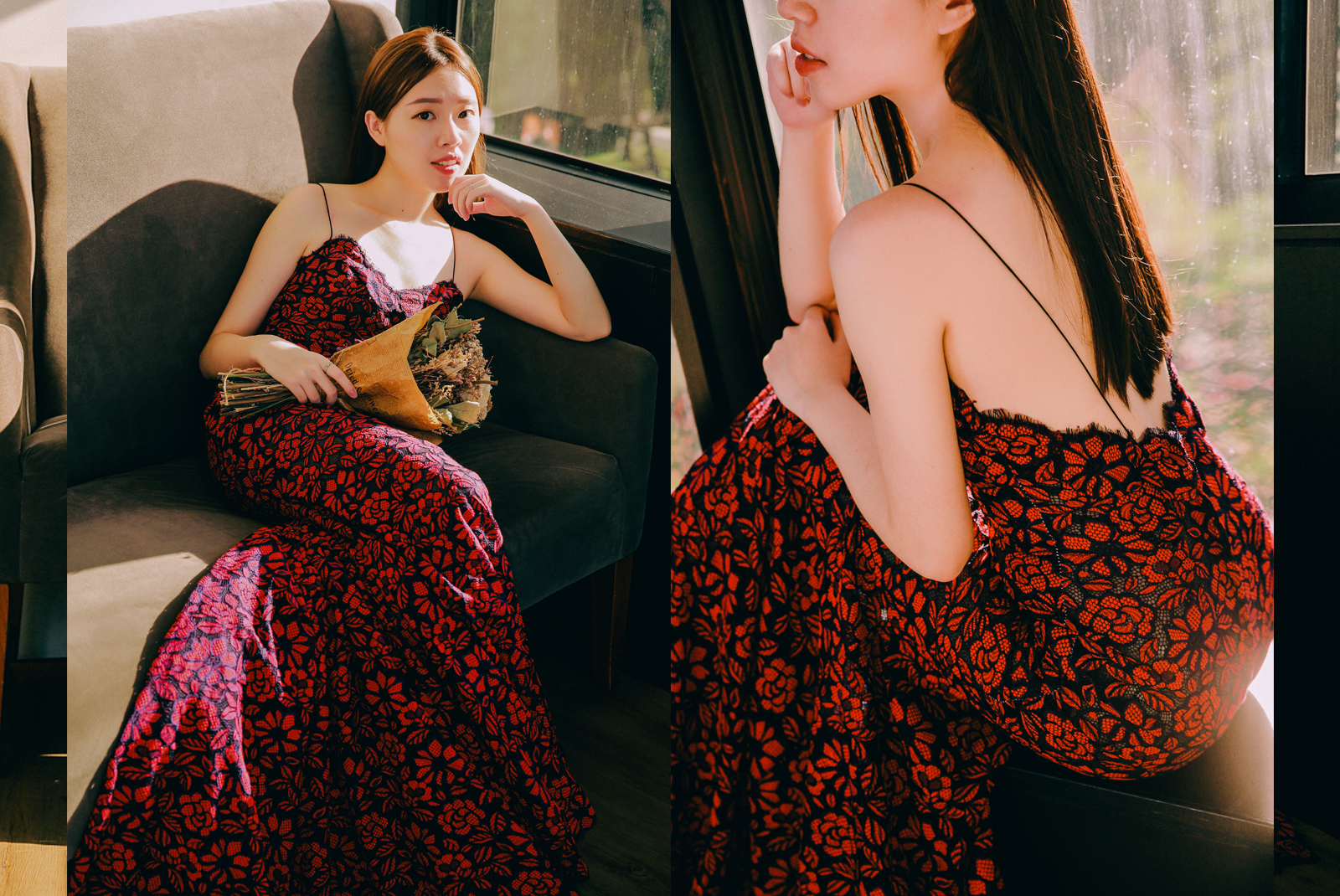 這件禮服做的比較偏向時裝感,肩帶有別以往選用極細的線條,延伸到背部,背面做大挖空的設計,展現你迷人的身形,上半身採用蕾絲收邊設計,以黑色透膚蕾絲上面再刺上一朵朵的紅色玫瑰,微微透出性感,剪裁也是屬於修身的設計,處處展現曼妙的曲線,散發出女人特有的魅力。