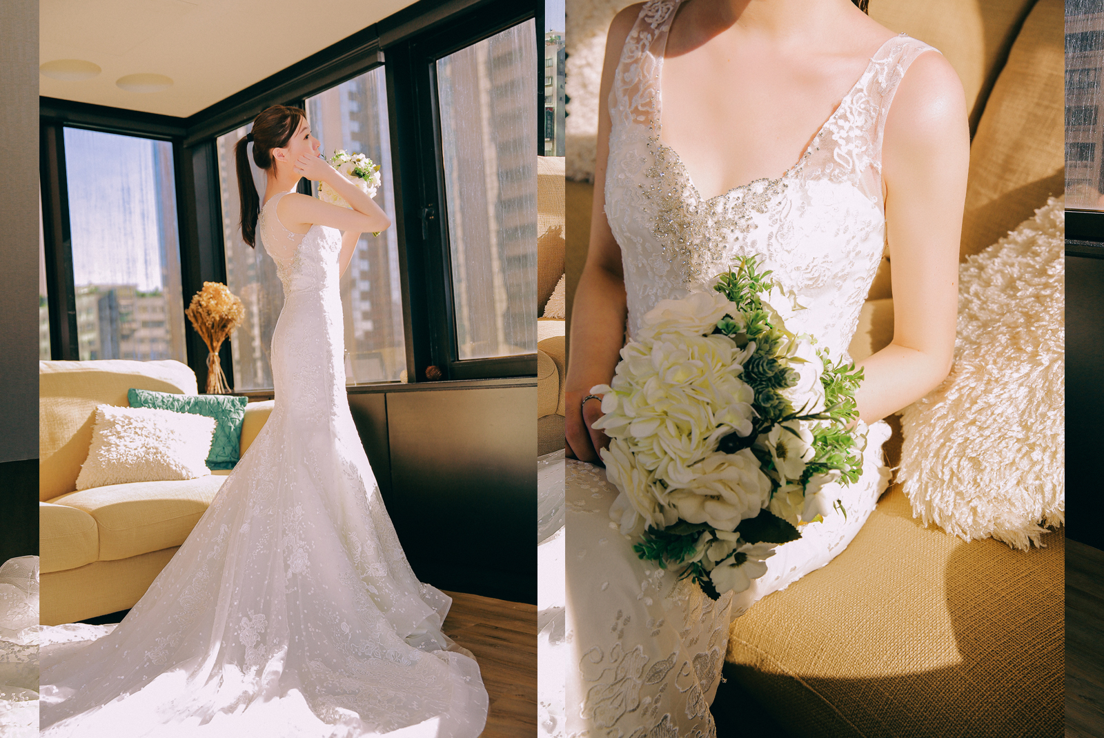 蕾絲跟珠鑽的做工都非常細緻,細薄軟紗親膚貼身,在陽光的折射下,透膚的蕾絲在舞動的裙擺間透出微微的性感,這件真的太美了~與眾不同的設計,相信賓客的記憶度一定會很高!