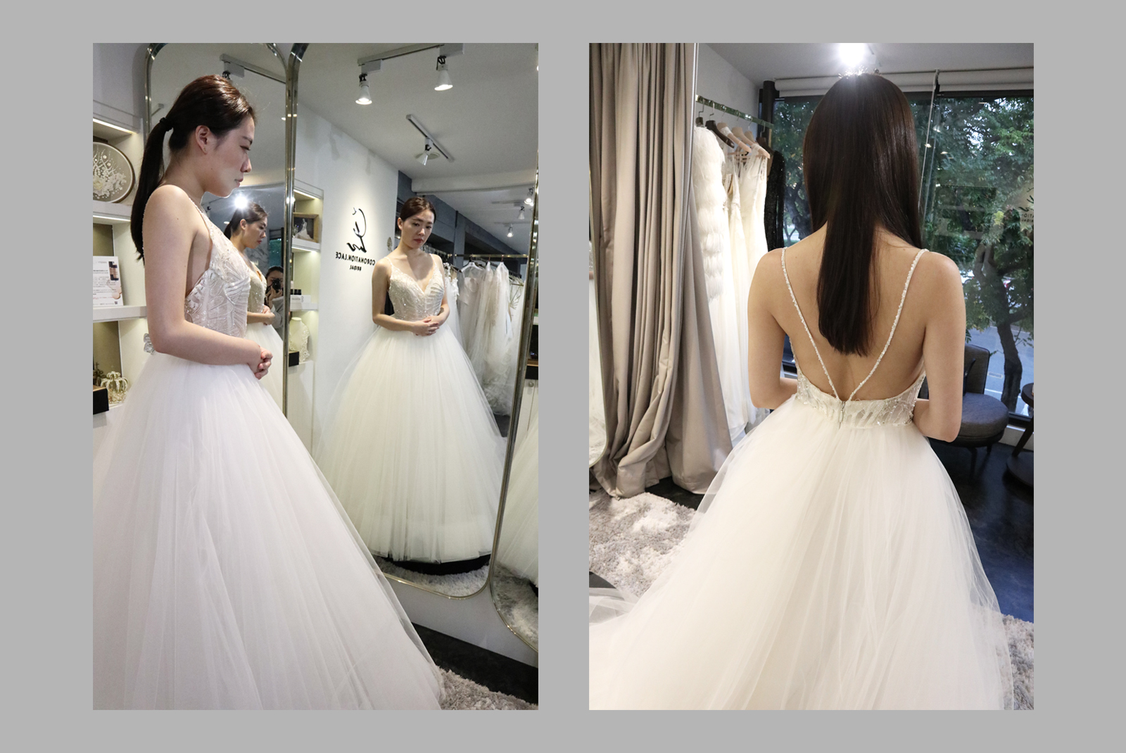 在挑選禮服的時候我真的發出各種讚嘆聲,好美啊~每一件禮服的細緻度以及蕾絲的質感,每塊布料用得如此高雅精緻,我直接在二樓迷失,因為我挑不出來要穿哪一件,每一件我都想穿!