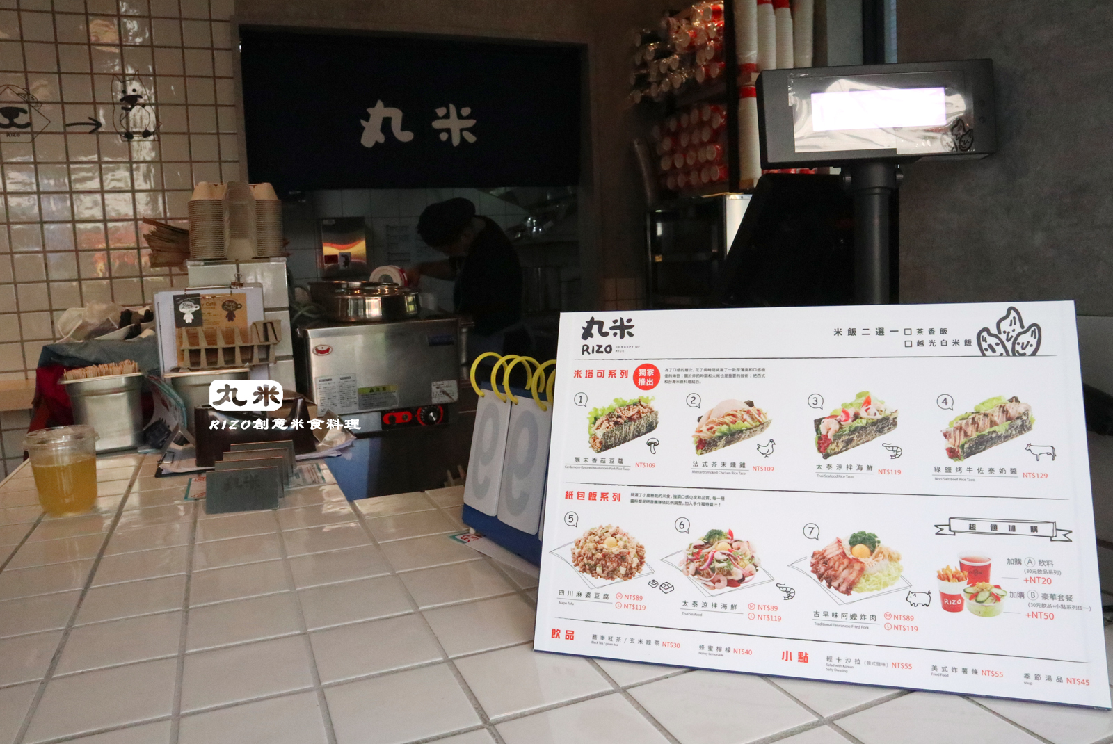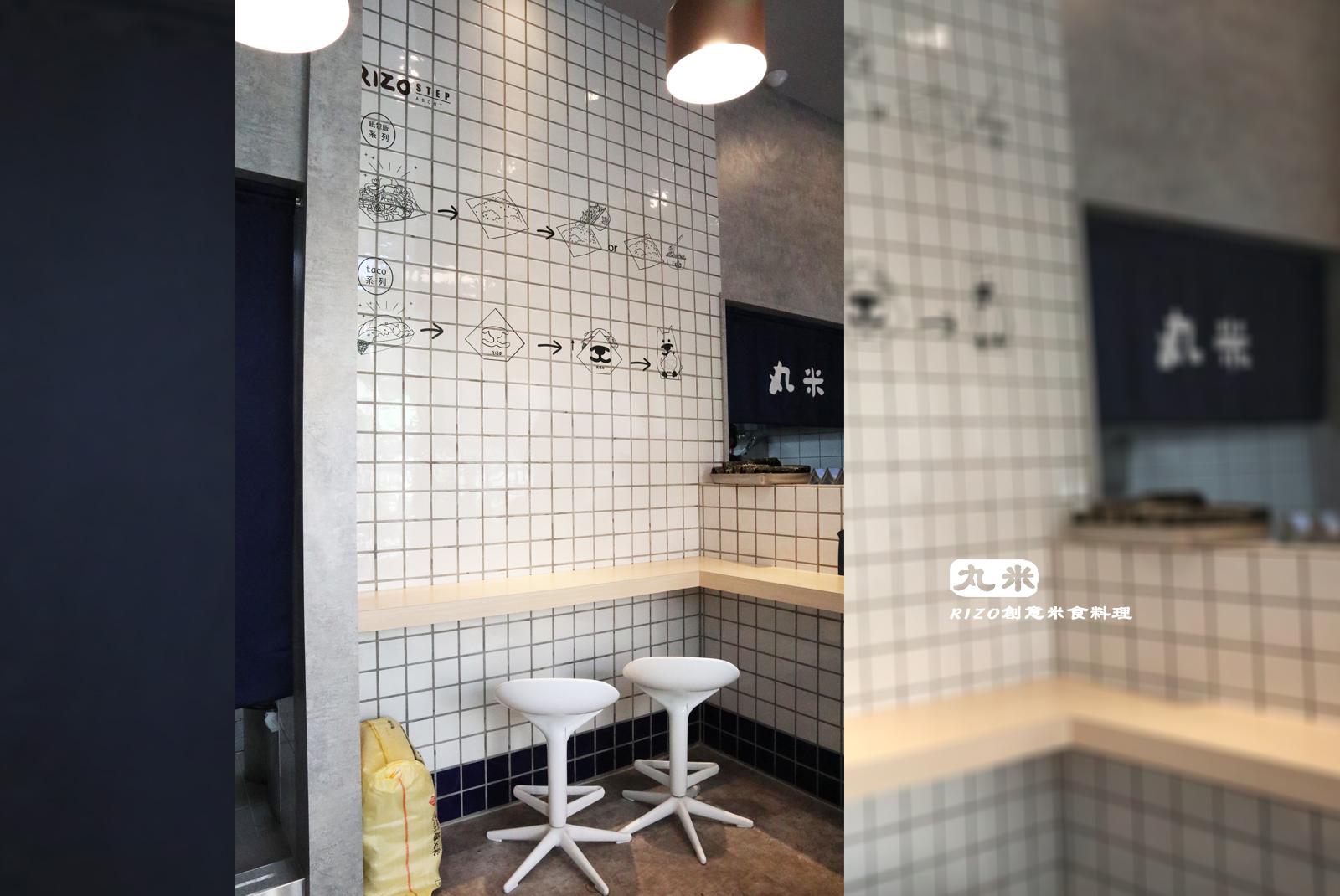 丸米主要販售兩大系列,分別為「Taco米可塔」及「紙包飯」,牆上磁磚也特別將兩個系列用圖像的方式呈現