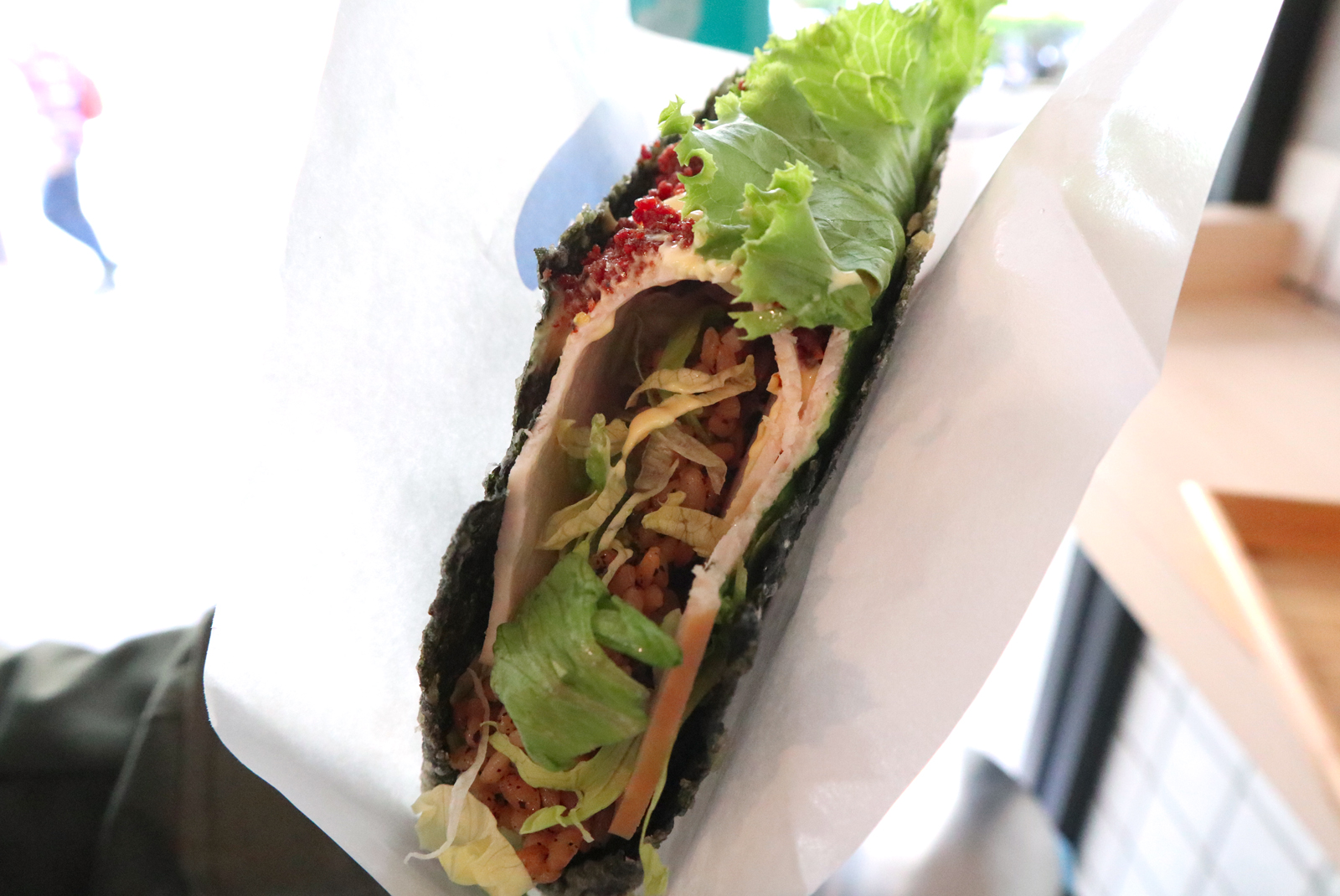 裡面包覆的米飯也有先調味過,再放入新鮮的生菜,最上面擠上法式黃芥末不會過於刺鼻嗆辣,一口咬下有著海苔的酥脆、Q彈的米飯,再搭配新鮮的萵苣,味蕾豐富整體清爽不膩口,讓人想一個接著一個吃下去