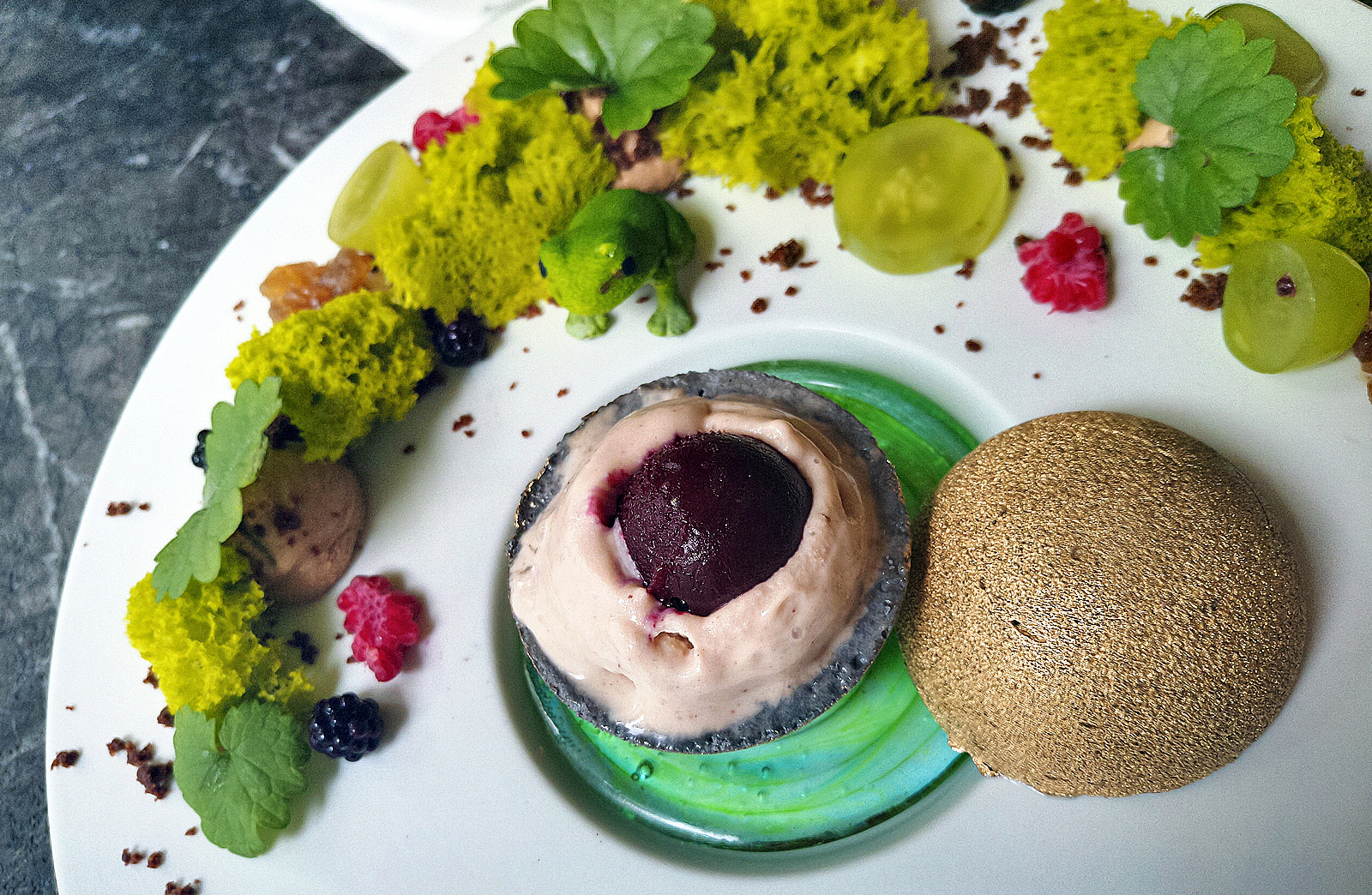 外層為黑芝麻蛋白餅,敲開後裡面是栗子冰淇淋在包裹黑醋栗酸酸甜甜的滋味令人難以忘懷,旁邊像是裝飾的草其實是海綿蛋糕、葡萄等